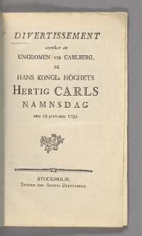 Divertissement anstält af ungdomen vid Carlberg, på hans kongl. höghets hertig Carls namnsdag den 28 januarii 1793 Fritt Upphov Ingen uppgift Utgivningsår Ingen uppgift Kategori Ej skönlitteraturDivertimenti