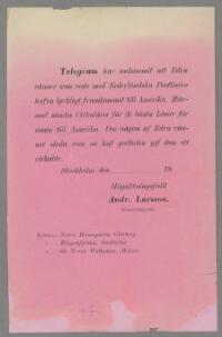 Telegram har ankommit att edra vänner som reste med Nederländska postlinien hafva lyckligt framkommit till Amerika..