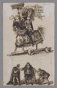 En karikatyr av en kung till häst på en pedistal. Nedanför syns två män kyssa en konungs händer Fritt Upphov Sunding Utgivningsår Ingen uppgift Kategori BildHumoristiska bilderBläck- och tuschteckningarBilder