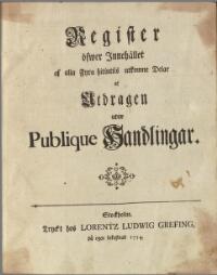Register öfwer innehållet af alla fyra hitintils utkomne delar af utdragen utur publique handlingar