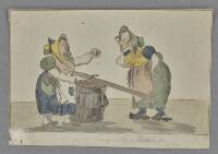 Två kvinnor har en dispyt vid en tunna Fritt Upphov Mörck, Carl Fredrik, 1721-1764 Utgivningsår 1740 Kategori BildBilderAkvarellerHumoristiska bilderSkämtteckningar