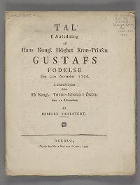 Tal i anledning af hans kongl. höghet kron-prinsen Gustafs födelse den 9:de november 1799. I underdånighet hållit på kongl. trivial-scholan i Örebro den 11 december af Samuel Sahlstedt. Örebro, tryckt hos Nils Magnus Lindh, 1799