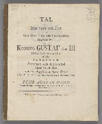 Tal, hållit af konungen uti ordens-capellet i Stockholms slott den 28 april 1791, då til riddare af seraphimer-orden dubbades öfverste kammar-junkaren ... Gustaf Magnusson Armfelt efter fält-marskalken ... Gustaf D. Hamilton, en af rikets, herrar. General-lieutenanten Philip Julius Bernhard von Platen efter riks-rådet ... Christopher Falkengren. Hennes maj:t drottningens öfverste marskalk ... Johan Gabriel Oxenstjerna efter riks-rådet ... Anders Johan von Höpken; och presidenten : uti kammar-revisionen grefve Adolph Fredric Munck efter för detta riks-rådet ... Mathias von Hermansson. På hvilken dag äfven å konungens vägnar af hennes maj:t ryska kejsarinnan dubbades til riddare af seraphimer orden general en chef : och plenipotentiaire-ministren vid Werelä freds-fördrag ... Otto Igelström efter för detta riks-rådet ... Eric von Stockenström. (Med konungens nådigste tilstånd uplagt af svenska academien. Stockholm, tryckt i kongl. tryckeriet, MDCCXCI.)