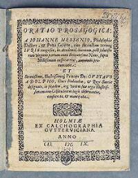 Gratvlatoria in honorem ornatißimi & doctißimi viri, dn. Ionæ Nicolai Oriensvlani Svecosmolandi, cùm ipsi XIV. calend april. anno salutis Christianæ M. D. CV. in inclijta Academia Witebergensi ... illustrißimo celsißimoq´principe ac domino dn. Avgvsto II. dvce Saxoniæ ... prorectore ... dn. Leonharto Hvttero ... decano spectabili & clarißimo viro, dn. m. Lavrentio Fabricio Dantiscano ... scripta ab amicis popularibus.
