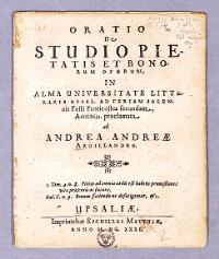 Oratio de studio pietatis. Quam ... in auditorio veteri majori, XI. , anno M. D. C. XXXIV. publicitus recitabat, Johannes N. Bringius Smolandus ..., (Upps. 11 maj 1634.).