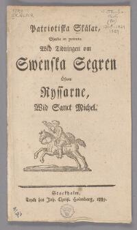 Patriotiska skålar, gjorde in promtu wid tidningen om swenska segren öfwer ryssarne, wid Sanct Michel. Stockholm, tryckt hos Joh. Christ. Holmberg, 1789