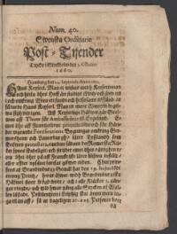 POSTTIDNINGAR 1680-10-05 Fritt Upphov Ingen uppgift Utgivningsår 1680 Ingår i samling Post och inrikes tidningar 1645-1705Posttidningar Kategori Tidningsnummer