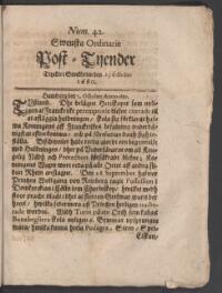 POSTTIDNINGAR 1680-10-26 Fritt Upphov Ingen uppgift Utgivningsår 1680 Ingår i samling Post och inrikes tidningar 1645-1705Posttidningar Kategori Tidningsnummer