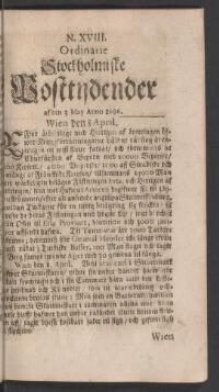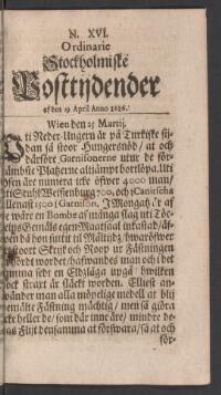POSTTIDNINGAR 1686-04-26 Fritt Upphov Ingen uppgift Utgivningsår 1686 Ingår i samling Post och inrikes tidningar 1645-1705Posttidningar Kategori Tidningsnummer