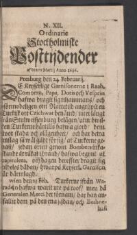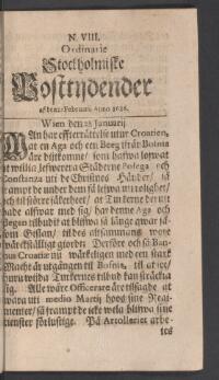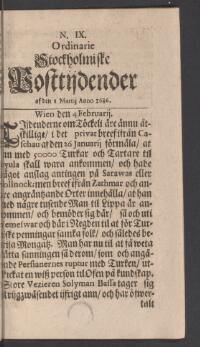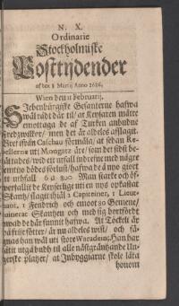 POSTTIDNINGAR 1686-03-08 Fritt Upphov Ingen uppgift Utgivningsår 1686 Ingår i samling Post och inrikes tidningar 1645-1705Posttidningar Kategori Tidningsnummer