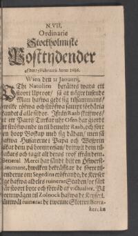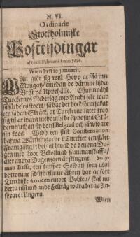 POSTTIDNINGAR 1686-01-04 Fritt Upphov Ingen uppgift Utgivningsår 1686 Ingår i samling Post och inrikes tidningar 1645-1705Posttidningar Kategori Tidningsnummer