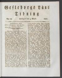 GEFLEBORGS LÄNS TIDNING 1837-03-04 Fritt Upphov Ingen uppgift Utgivningsår 1837 Ingår i samling Gefleborgs läns tidning (1836) Kategori Tidningsnummer