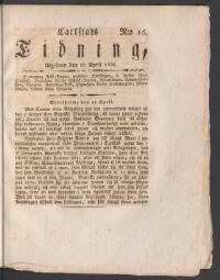 CARLSTADS TIDNING 1808-04-16 Fritt Upphov Ingen uppgift Utgivningsår 1808 Ingår i samling Carlstads tidning Kategori Tidningsnummer