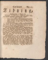 CARLSTADS TIDNING 1808-06-11 Fritt Upphov Ingen uppgift Utgivningsår 1808 Ingår i samling Carlstads tidning Kategori Tidningsnummer