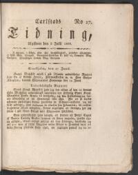 CARLSTADS TIDNING 1808-07-09 Fritt Upphov Ingen uppgift Utgivningsår 1808 Ingår i samling Carlstads tidning Kategori Tidningsnummer