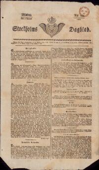STOCKHOLMS DAGBLAD 1824-08-18 Fritt Upphov Ingen uppgift Utgivningsår 1824 Ingår i samling Stockholms dagblad Kategori Tidningsnummer