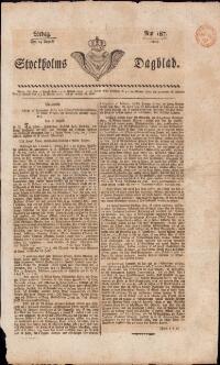 STOCKHOLMS DAGBLAD 1824-08-07 Fritt Upphov Ingen uppgift Utgivningsår 1824 Ingår i samling Stockholms dagblad Kategori Tidningsnummer