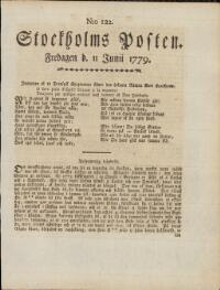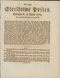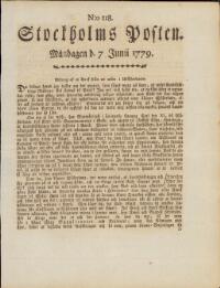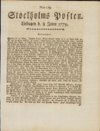 STOCKHOLMSPOSTEN 1779-06-14 Fritt Upphov Ingen uppgift Utgivningsår 1779 Ingår i samling Stockholms Posten (Online) Kategori Tidningsnummer