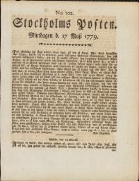 STOCKHOLMSPOSTEN 1779-05-17 Fritt Upphov Ingen uppgift Utgivningsår 1779 Ingår i samling Stockholms Posten (Online) Kategori Tidningsnummer