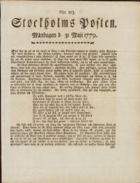 STOCKHOLMSPOSTEN 1779-05-31 Fritt Upphov Ingen uppgift Utgivningsår 1779 Ingår i samling Stockholms Posten (Online) Kategori Tidningsnummer