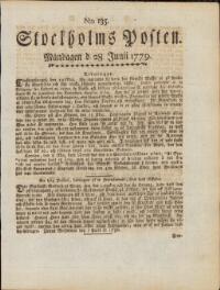 STOCKHOLMSPOSTEN 1779-06-28 Fritt Upphov Ingen uppgift Utgivningsår 1779 Ingår i samling Stockholms Posten (Online) Kategori Tidningsnummer
