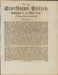 STOCKHOLMSPOSTEN 1779-05-20 Fritt Upphov Ingen uppgift Utgivningsår 1779 Ingår i samling Stockholms Posten (Online) Kategori Tidningsnummer