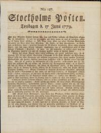STOCKHOLMSPOSTEN 1779-06-17 Fritt Upphov Ingen uppgift Utgivningsår 1779 Ingår i samling Stockholms Posten (Online) Kategori Tidningsnummer