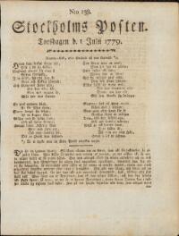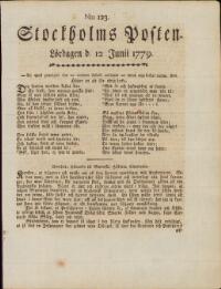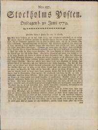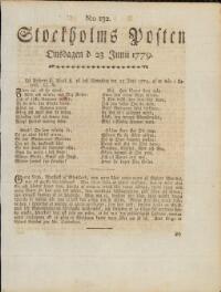 STOCKHOLMSPOSTEN 1779-06-23 Fritt Upphov Ingen uppgift Utgivningsår 1779 Ingår i samling Stockholms Posten (Online) Kategori Tidningsnummer