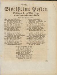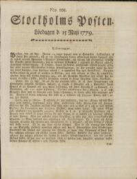 STOCKHOLMSPOSTEN 1779-05-15 Fritt Upphov Ingen uppgift Utgivningsår 1779 Ingår i samling Stockholms Posten (Online) Kategori Tidningsnummer