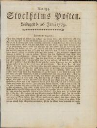 STOCKHOLMSPOSTEN 1779-06-26 Fritt Upphov Ingen uppgift Utgivningsår 1779 Ingår i samling Stockholms Posten (Online) Kategori Tidningsnummer