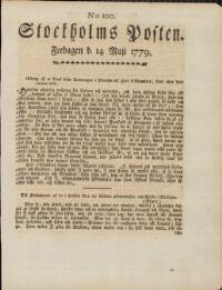 STOCKHOLMSPOSTEN 1779-05-14 Fritt Upphov Ingen uppgift Utgivningsår 1779 Ingår i samling Stockholms Posten (Online) Kategori Tidningsnummer