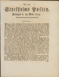 STOCKHOLMSPOSTEN 1779-05-28 Fritt Upphov Ingen uppgift Utgivningsår 1779 Ingår i samling Stockholms Posten (Online) Kategori Tidningsnummer