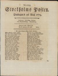 STOCKHOLMSPOSTEN 1779-05-26 Fritt Upphov Ingen uppgift Utgivningsår 1779 Ingår i samling Stockholms Posten (Online) Kategori Tidningsnummer