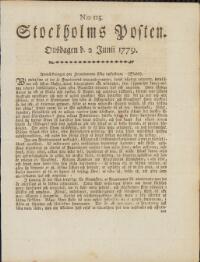 STOCKHOLMSPOSTEN 1779-06-15 Fritt Upphov Ingen uppgift Utgivningsår 1779 Ingår i samling Stockholms Posten (Online) Kategori Tidningsnummer