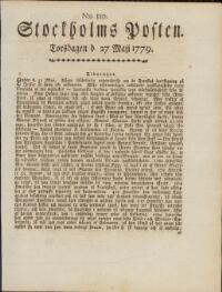 STOCKHOLMSPOSTEN 1779-05-27 Fritt Upphov Ingen uppgift Utgivningsår 1779 Ingår i samling Stockholms Posten (Online) Kategori Tidningsnummer