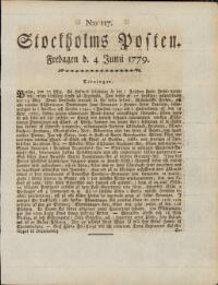 STOCKHOLMSPOSTEN 1779-06-07 Fritt Upphov Ingen uppgift Utgivningsår 1779 Ingår i samling Stockholms Posten (Online) Kategori Tidningsnummer