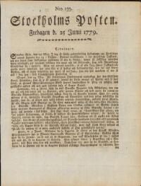 STOCKHOLMSPOSTEN 1779-06-25 Fritt Upphov Ingen uppgift Utgivningsår 1779 Ingår i samling Stockholms Posten (Online) Kategori Tidningsnummer