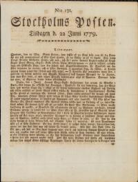 STOCKHOLMSPOSTEN 1779-06-22 Fritt Upphov Ingen uppgift Utgivningsår 1779 Ingår i samling Stockholms Posten (Online) Kategori Tidningsnummer