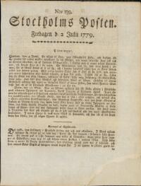 STOCKHOLMSPOSTEN 1779-07-01 Fritt Upphov Ingen uppgift Utgivningsår 1779 Ingår i samling Stockholms Posten (Online) Kategori Tidningsnummer