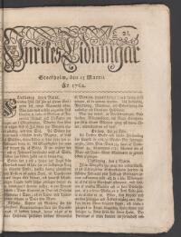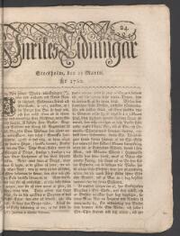INRIKES TIDNINGAR 1762-03-22 Fritt Upphov Ingen uppgift Utgivningsår 1762 Ingår i samling Inrikes tidningar Kategori Tidningsnummer