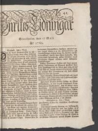 INRIKES TIDNINGAR 1762-05-17 Fritt Upphov Ingen uppgift Utgivningsår 1762 Ingår i samling Inrikes tidningar Kategori Tidningsnummer