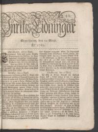 INRIKES TIDNINGAR 1762-05-13 Fritt Upphov Ingen uppgift Utgivningsår 1762 Ingår i samling Inrikes tidningar Kategori Tidningsnummer