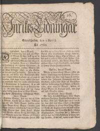INRIKES TIDNINGAR 1762-04-01 Fritt Upphov Ingen uppgift Utgivningsår 1762 Ingår i samling Inrikes tidningar Kategori Tidningsnummer