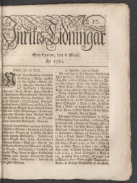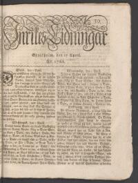 INRIKES TIDNINGAR 1762-04-17 Fritt Upphov Ingen uppgift Utgivningsår 1762 Ingår i samling Inrikes tidningar Kategori Tidningsnummer