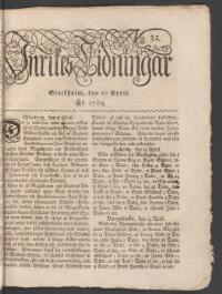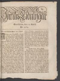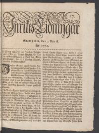 INRIKES TIDNINGAR 1762-04-22 Fritt Upphov Ingen uppgift Utgivningsår 1762 Ingår i samling Inrikes tidningar Kategori Tidningsnummer