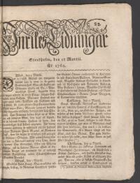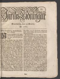 INRIKES TIDNINGAR 1762-03-25 Fritt Upphov Ingen uppgift Utgivningsår 1762 Ingår i samling Inrikes tidningar Kategori Tidningsnummer
