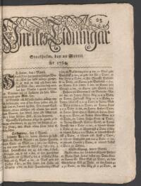 INRIKES TIDNINGAR 1762-03-18 Fritt Upphov Ingen uppgift Utgivningsår 1762 Ingår i samling Inrikes tidningar Kategori Tidningsnummer
