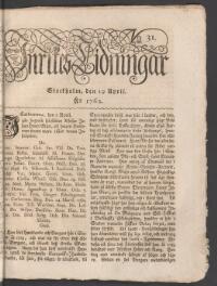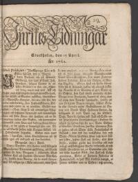 INRIKES TIDNINGAR 1762-04-19 Fritt Upphov Ingen uppgift Utgivningsår 1762 Ingår i samling Inrikes tidningar Kategori Tidningsnummer