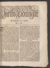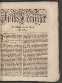 INRIKES TIDNINGAR 1762-06-21 Fritt Upphov Ingen uppgift Utgivningsår 1762 Ingår i samling Inrikes tidningar Kategori Tidningsnummer