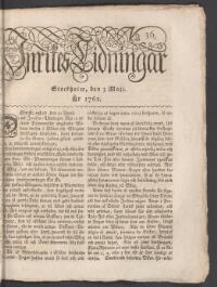 INRIKES TIDNINGAR 1762-05-03 Fritt Upphov Ingen uppgift Utgivningsår 1762 Ingår i samling Inrikes tidningar Kategori Tidningsnummer